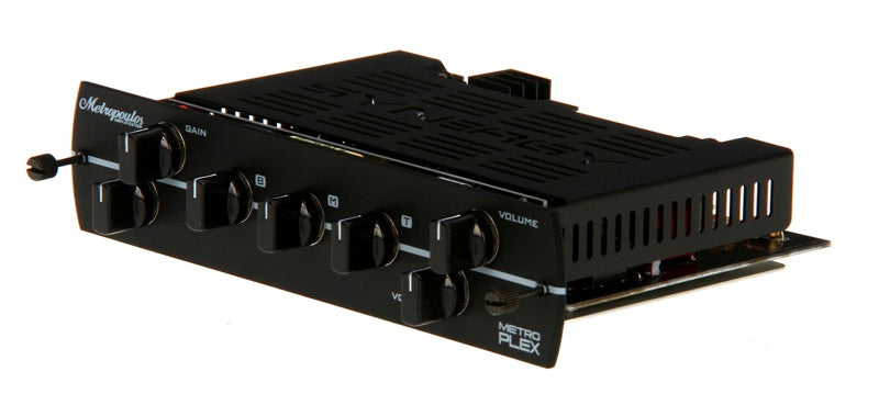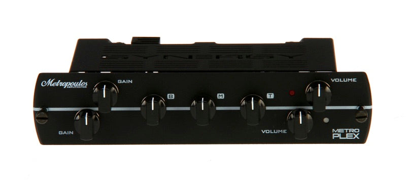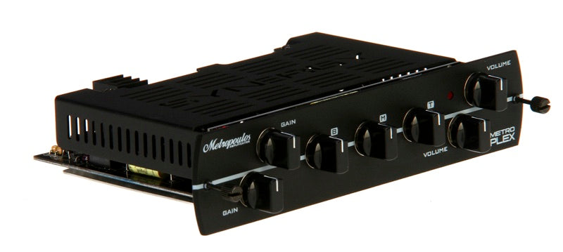 The Metro-Plex Synergy module features switchable gain and volume controls along with shared treble, middle and bass controls.